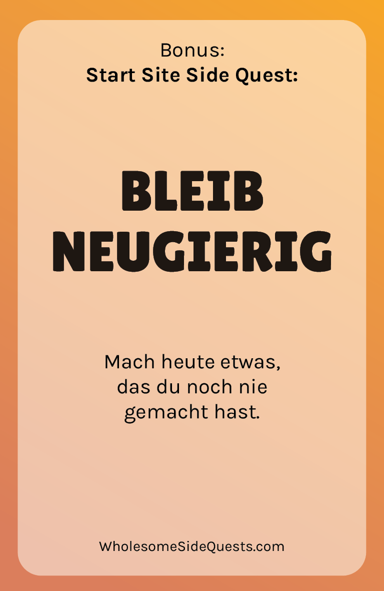 Falls du die Side Quest annimmst: Erfülle sie innerhalb von 24 Stunden und nutz die Chance, dir selbst dabei was Gutes zu tun. (Die meisten Side Quests machen genau das!). Danach sei begeistert! Mehr Wholesome Side Quests gibts (hier!)
